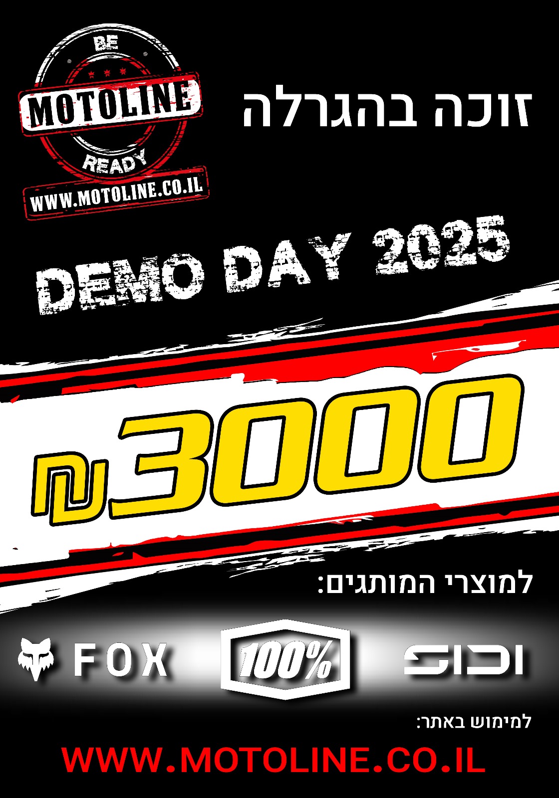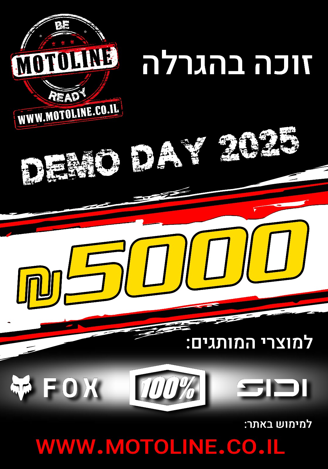 - שלוש הגרלות ענק של מוטוליין על פרסים חסרי תקדים– 1,000 שקלים, 3,000 שקלים וההגרלה המרכזית על 5,000 שקלים לרכישה באתר מוטוליין. אופן ההשתתפות, זמנים פרטים מלאים כאן