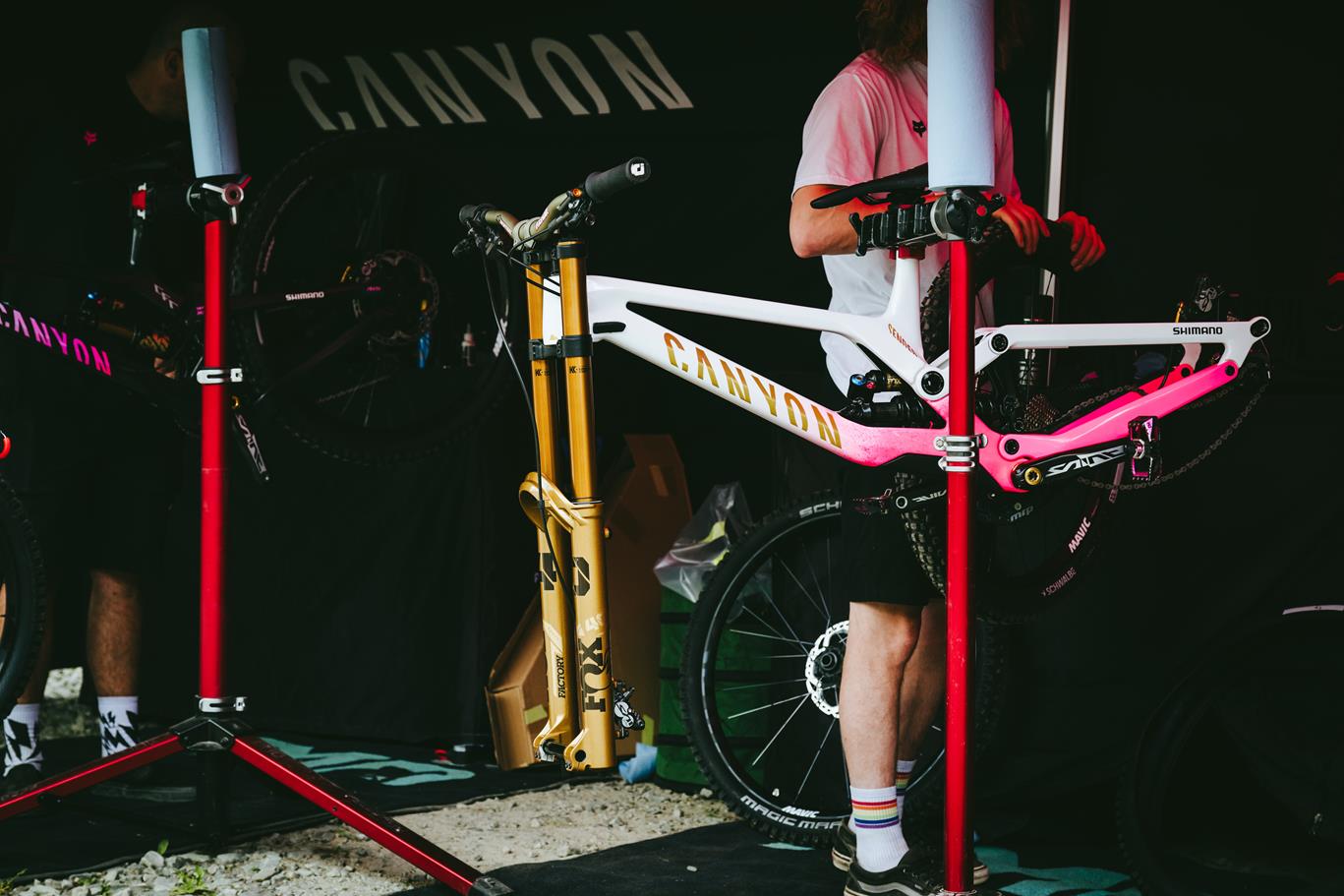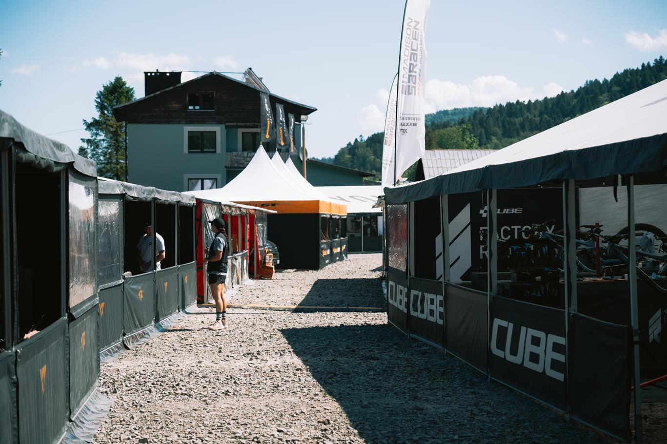 מירוץ הדאונהיל התקיים בעיירה Szczrk (מבטאים את זה משהו כמו- שצ’רק) ובאזור הרכבל שמעלה למסלולים של הבייק-פארק ומסלול התחרות, נבנה גם כפר התחרות שהוא בעצם אזור הסיום הענק עם שער הסיום ויציע צפיה, והחלק היותר מעניין מבחינתי, ה Pits- האזור התפעולי של הספורטאים והקבוצות המתחרות. המראה המוכר והמלהיב עם משאיות הענק והאוהלים המפוארים שדרכם אפשר לראות את המכונאים של מיטב הרוכבים מכינים את האופניים למירוץ, או את המתחמים של RockShox ו Fox שמטפלים בכל הבולמים של כל קבוצות העילית.