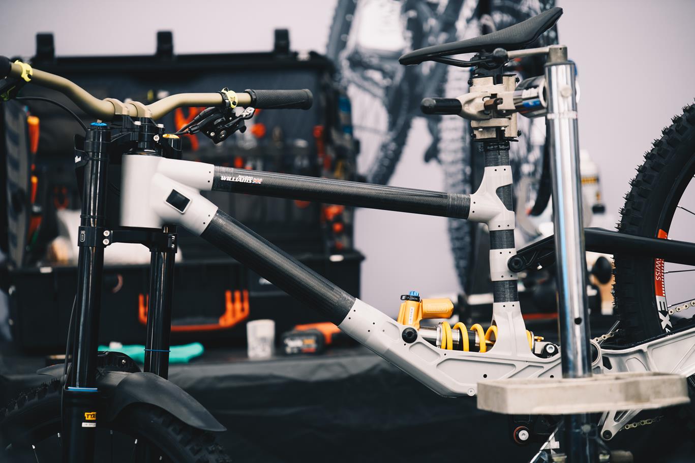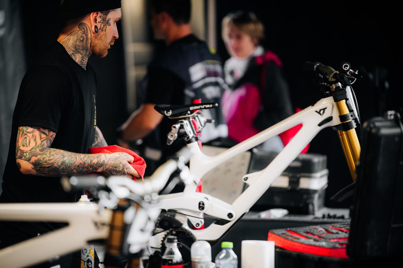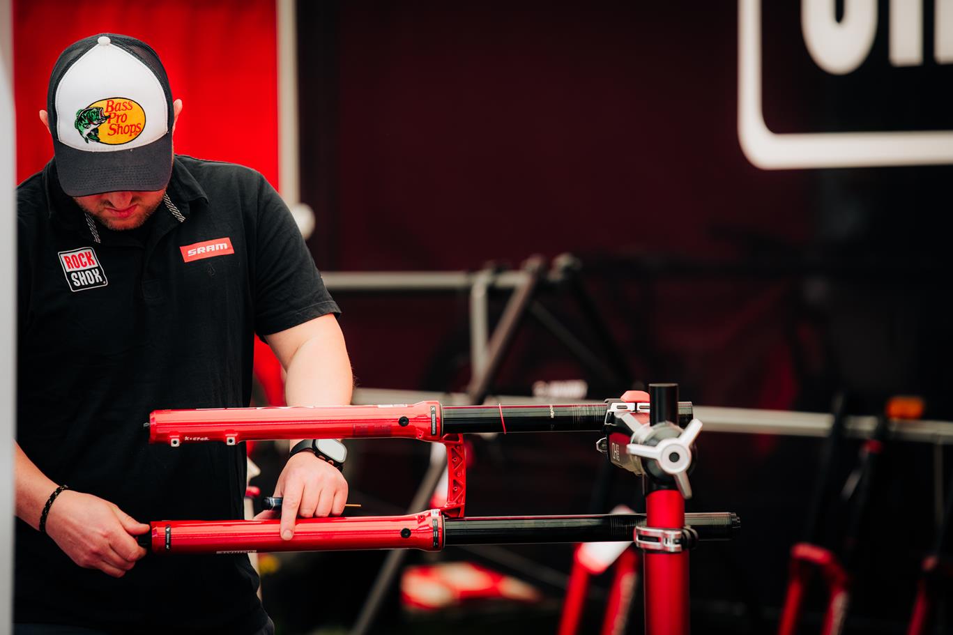 בולמים שמחכים לטיפול באוהל של RockShox