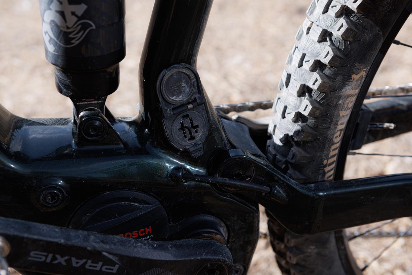 מערכת ההילוכים היא ה- SRAM AXS T TYPE החשמלית אלחוטית שנראה שהופכת להיות נפוצה יותר ויותר בדגמי 2024, ולא בכדי. המערכת מרשימה, קלה לתפעול, וההעברה נשארה חלקה ומדויקת גם לאחר שהמעביר נחבט בסלעים.