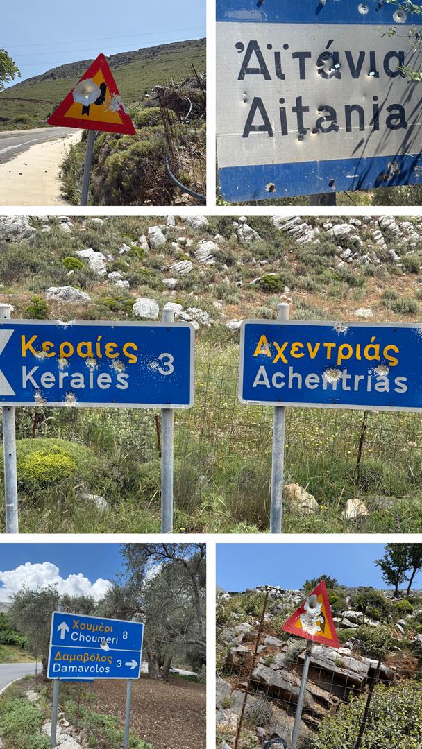 כבר ביום הראשון נגלתה לי עובדה מדהימה. אנשי האי לא יכולים לשאת שלטי דרך, חמתם בוערת בהם להשחית ממש אל מולם. אין, אין שלט אחד בכל כרתים, שאינו מנוקב בכדורים. וכשאני אומר מנוקב בכדורים, הכוונה היא ל 5.56, עבור בכדוריות צייד, וכלה ב RPG, לאו ומטל"רים- I shit you not.